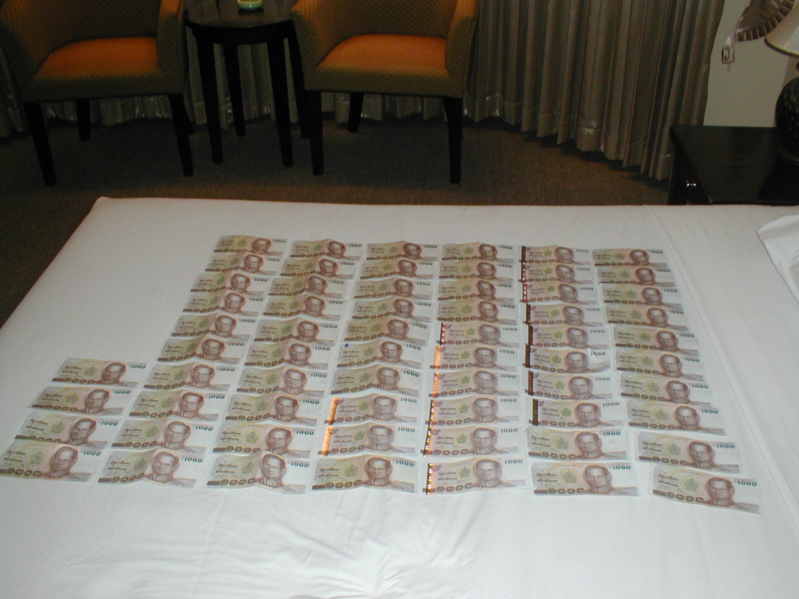 ホテルに戻り再びプロモーションチップを購入し早速リベンジ開始。この日はかなりツキがあるらしく2倍~3倍のところに2000バーツ単位で勝負していたら。結構いい感じで当たる。昨日の負けも一気に取り戻し。結局この日トータルプラスで終える。調子に乗って手持ちの6万6千バーツをベッドの上に並べて写真に撮ったりした。
